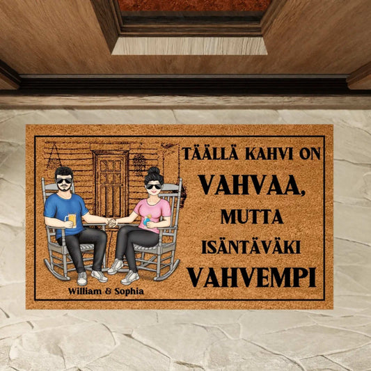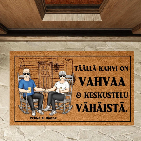 Ikääntynyt perhepariskunta – Kahvi on vahvaa – Personoitu kynnysmatto