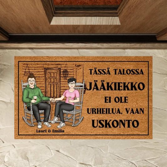 Ikääntynyt perhepariskunta – Jääkiekko ei ole urheilua – Personoitu kynnysmatto