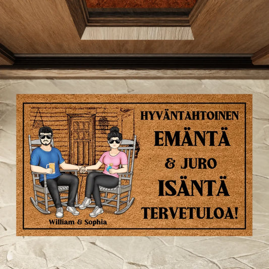Ikääntynyt perhepari – Hyväntahtoinen emäntä ja juro isäntä – Personoitu kynnysmatto