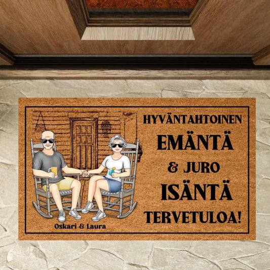 Ikääntynyt perhepari – Hyväntahtoinen emäntä ja juro isäntä – Personoitu kynnysmatto